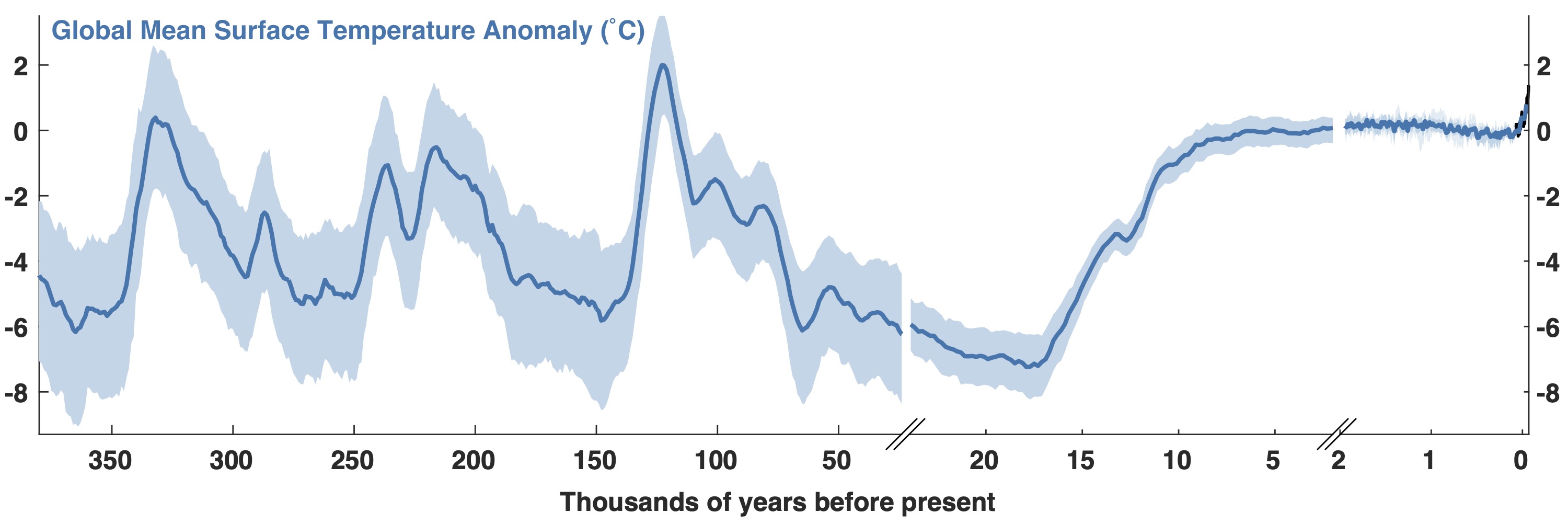 That’s about seven degrees Celsius colder than Earth is today! To put it in context: as I record this, Earth’s average temperature has warmed by about 1.5 degrees Celsius relative to where it stood in the late nineteenth century.